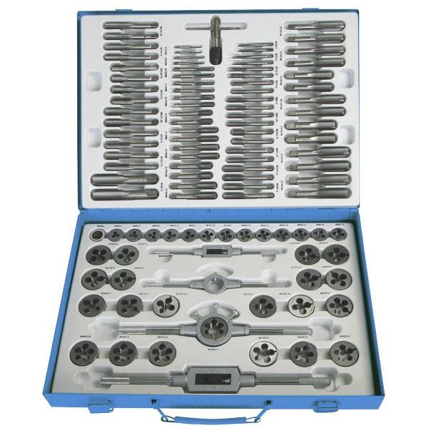 Zestaw gwintowników i narzynek GSR M - MF, składający się z 110 elementów, to zestaw narzędzi do gwintowania metrycznego i metrycznego drobnozwojowego, wewnętrznych i zewnętrznych gwintów. Nadaje się do miękkich stali konstrukcyjnych o wytrzymałości do 500 N/mm². Również do stali automatowych i konstrukcyjnych o wytrzymałości do 800 N/mm². Narzędzia wykonane są ze stali narzędziowej stopowej. Chronione solidną metalową obudową. Zawiera rozmiary od M2 do M18. 35 okrągłych narzynek w tych samych rozmiarach co gwintowniki. 2 uchwyty okrągłych narzynek. 2 regulowane klucze do gwintowników. 1 uchwyt narzędziowy. Zestaw gwintowników i narzynek GSR M - MF składający się z 110 elementów gwarantuje stałą, dobrą jakość i ogromną precyzję.