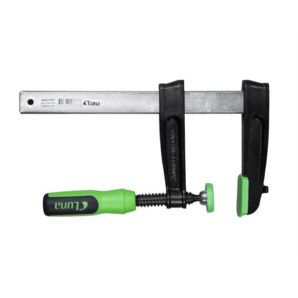 Z żeliwa ciągliwego. Szyna ze stali cynkowanej na połysk. Mocna śruba z gwintem prostokątnym, oksydowana, z płytką dociskową na przegubie kulowym, wyposażoną w kapturek z tworzywa sztucznego. Z rękojeścią dwukomponentową.