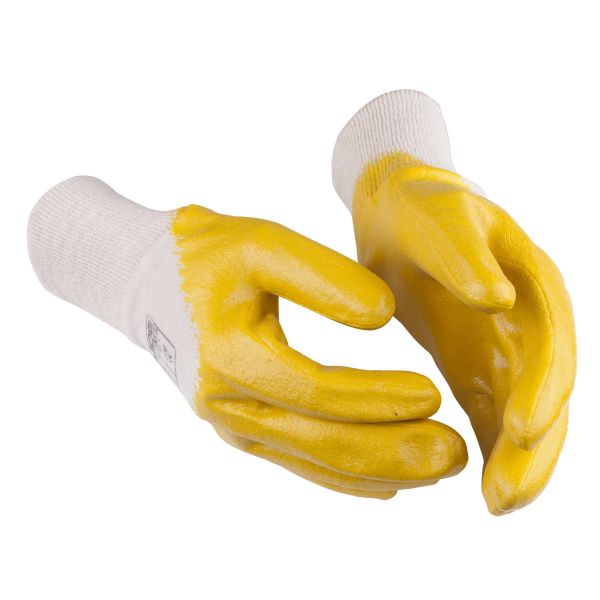 Grube rękawice robocze, knykcie powleczone nitrylem. Ściągacz w gumce uniemożliwia przesuwanie się rękawicy na dłoni.