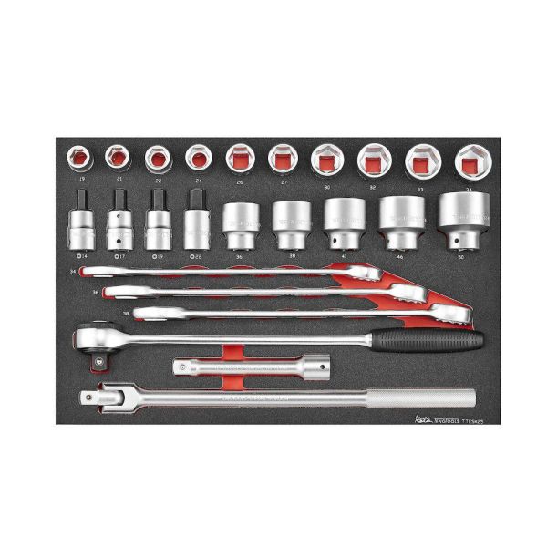 Ten zestaw TengTools zawiera 25 metrycznych nasadek 6-kątnych, kluczy i bitów sześciokątnych z napędem kwadratowym 3/4", zaprojektowanych do zadań związanych z ciężkim sprzętem przemysłowym lub montażem i mocowaniem w sektorze budowlanym. Wykonany z wysokiej jakości stali Cr-V i uzupełniony o bity ze stali S2 wysokiej jakości, zestaw zawiera również grzechotkę 72-zębową, przedłużkę i łamacz z elastyczną głowicą, aby zmaksymalizować zarówno moc, jak i wszechstronność. Nasadki mają zakres od 19 mm do 50 mm, a nasadki z bitami sześciokątnymi od 14 mm do 22 mm, co zapewnia wszechstronność w różnych zastosowaniach przemysłowych. Narzędzia są metodycznie zorganizowane w trójkolorowej, precyzyjnie ciętej piance EVA o wysokiej gęstości, zapewniając optymalną organizację i idealne dopasowanie do szuflad TengTools 26-calowych. Zestaw jest dostarczany w module narzędziowym o rozmiarze 4X4 (FOAM4X4).