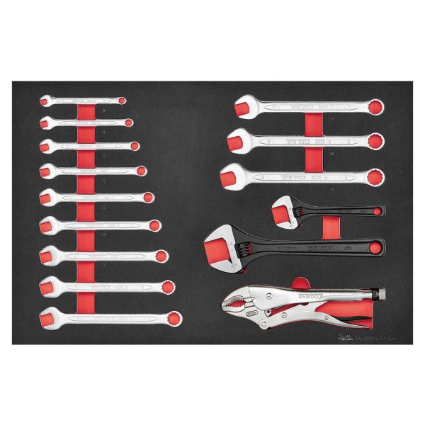 Zestaw TengTools TTESP15 zawiera 15 profesjonalnych kluczy i szczypiec, łączących metryczne klucze płasko-oczkowe, klucze nastawne oraz szczypce Power Grip. Zestaw zawiera 12-kątne klucze oczkowe i płaskie o rozwartości od 8 mm do 19 mm, z rozwartością obu końców taką samą. 15-stopniowe odchylenie ułatwia dostęp do płaskich powierzchni, a konstrukcja TengTools „Hip Grip” zapewnia dobre przyleganie do płaskich powierzchni, zmniejszając poślizg i zużycie. Wykonane ze stali chromowo-wanadowej z satynowym wykończeniem, klucze zapewniają wysoką trwałość i odporność na korozję, spełniając normy DIN 3113A. W zestawie znajdują się również dwa klucze nastawne (150 mm i 250 mm) do stosowania z różnymi rozmiarami śrub i nakrętek, a także szczypce Power Grip o zakrzywionych szczękach o długości 235 mm, zapewniające bezpieczne chwytanie i zaciskanie. Wszystkie narzędzia spełniają normy DIN i ISO, a waga zestawu wynosi 2,34 kg. Narzędzia są mocowane za pomocą trójkolorowej, precyzyjnie ciętej pianki EVA o wysokiej gęstości. Zestaw jest zorganizowany w module narzędziowym o rozmiarze 4x4 (FOAM4X4), kompatybilnym z systemem kontroli narzędzi TengTools.