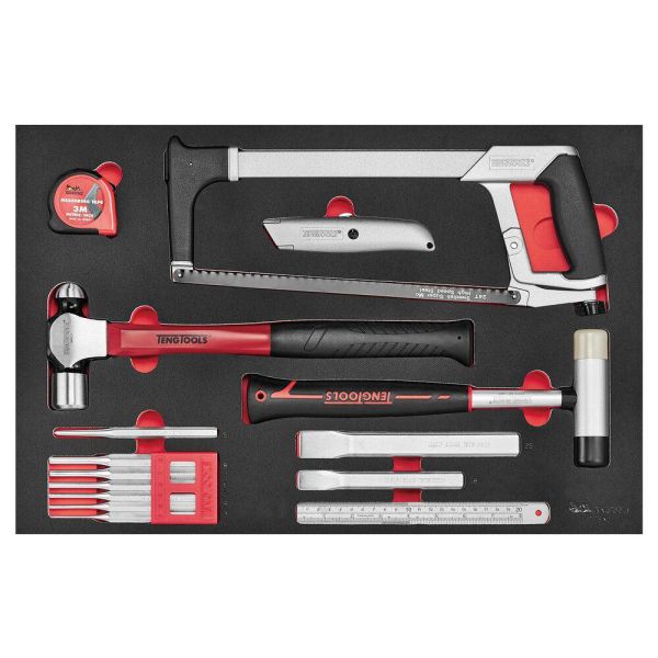 15-częściowy zestaw narzędzi ogólnego przeznaczenia. Piła ręczna 24 TPI do cięcia metalu. Nóż z ostrzem łamanym do użytku ogólnego. Dwa dłuta płaskie (18 mm i 25 mm). Punktak 5 mm. Wybijak (3 mm do 8 mm). Młotek z kulką o wadze 24 uncji (ok. 775 g). Plastikowy młotek. 3-metrowa taśma miernicza ze skalą metryczną i calową. 200-milimetrowa stalowa liniał z podziałką metryczną i calową. Wyprodukowano zgodnie z normami DIN i ISO. Narzędzia są zamocowane w precyzyjnie ciętej, trójkolorowej piance EVA o wysokiej gęstości. Narzędzia są uporządkowane w module narzędziowym 4x4 (FOAM4X4). Pasuje do szuflad TengTools 26" (575 mm x 380 mm). Kompatybilny z systemem kontroli narzędzi TengTools.