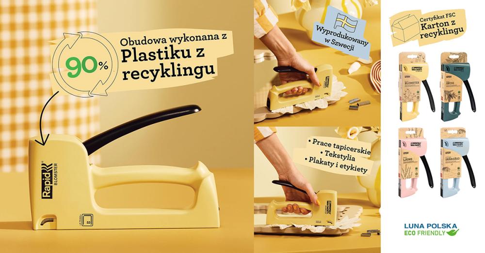 Drugi obieg czyli ponowne użycie surowców W dzisiejszych czasach niezwykle ważne staje się podejmowanie świadomych decyzji dotyczących ochrony środowiska. Ponowne wykorzystanie surowców przy projektowaniu narzędzi, odgrywa kluczową rolę w zrównoważonym rozwoju. Umożliwia to nie tylko zmniejszenie ilości odpadów, ale także wprowadzenie do obiegu wartościowych materiałów pochodzących z recyklingu. W ofercie naszej firmy znajduje się niezwykle praktyczna seria produktów – ZSZYWACZE RĘCZNE TAPICERSKIE marki RAPID R53E BLOMSTER (numer katalogowy 5001615). To narzędzia wyróżniające się tym, że wykonane są w 90% z plastiku pochodzącego z recyklingu, który pozyskiwany jest z wycofanych ze sprzedaży lodówek. Dzięki temu zyskujesz nie tylko efektywne narzędzie, ale także możliwość przyczynienia się do ochrony środowiska.