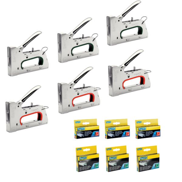 Zestaw 3 sztuk zszywaczy R34, 3 sztuk R353E, 3 opakowań (1 opakowanie - 2 500 sztuk) zszywek galwanizowanych 53/6 oraz 3 opakowań (1 opakowanie - 2 000 sztuk) zszywek galwanizowanych 140/6 dostarczany w ekspozytorze ladowym.